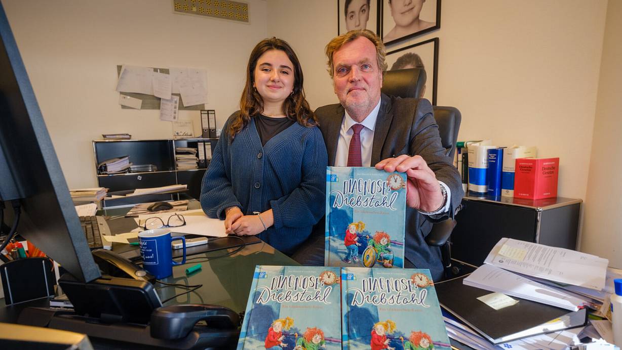 Diagnose Diebstahl: Jost Hinrich Streitbörger und Tochter Carla, die ihn zum "Glasknochen-Krimi" inspiriert hat, mit den druckfrischen Kinderbüchern im Büro des Anwalts am Adenauerplatz. | © Andreas Zobe