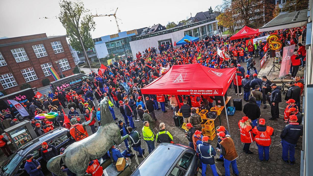 Die Verhandlungen zwischen der IG Metall und dem Arbeitgeberverband Metall NRW gehen in die vierte Runde. Das bisherige Ergebnis empört die Demonstranten.