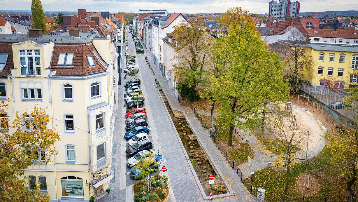 Zehn Jahre lang war die Ravensberger Straße eine Baustelle. Seit vier Monaten fließt nun das Wasser der Lutter offen dahin - und das Quartier ist aufgeblüht. | © Mike-Dennis Müller / www.mdm.photo