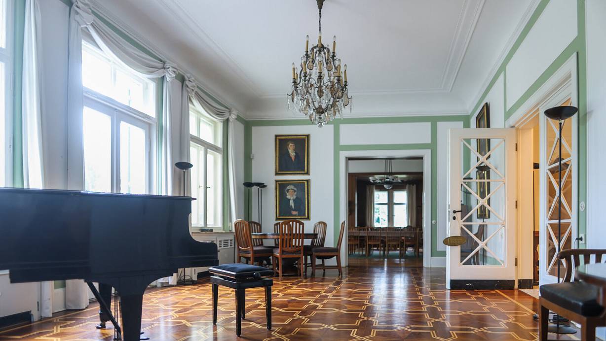 Das Empfangszimmer hinter der Freitreppe, mit schwarzem Klavier und Ahnenbildern. | © Sarah Jonek Fotografie