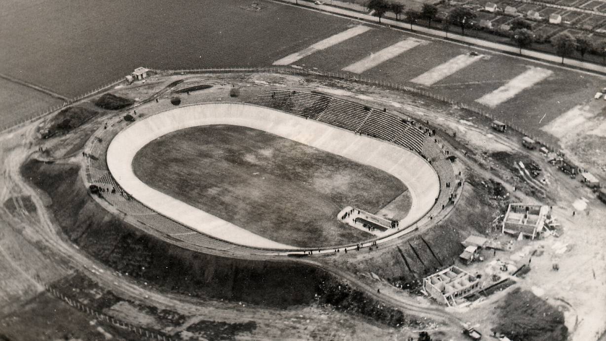 Eine der schnellsten Betonpisten Europas: Die 333,33 Meter lange Radrennbahn an der Heeper Straße im Bau. Kriegsschutt, Müll und Muttererde wurden aufgeschüttet. | © Sammlung Michael Mertins