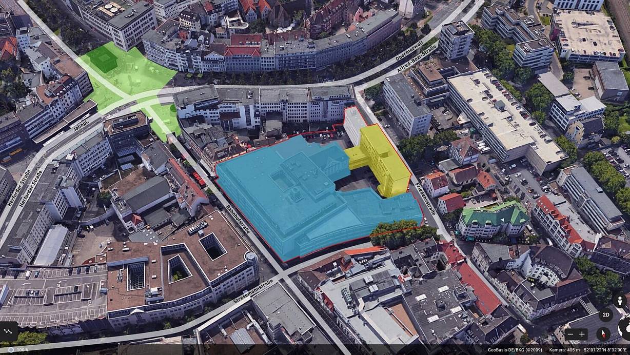 Der Jahnplatz aus der Vogelperspektive. Die grüne Fläche zeiht die Dimensionen des unterirdischen Jahnplatzforums. Foto: ZREV | © ZAMBERK REAL ESTATE VENTURES