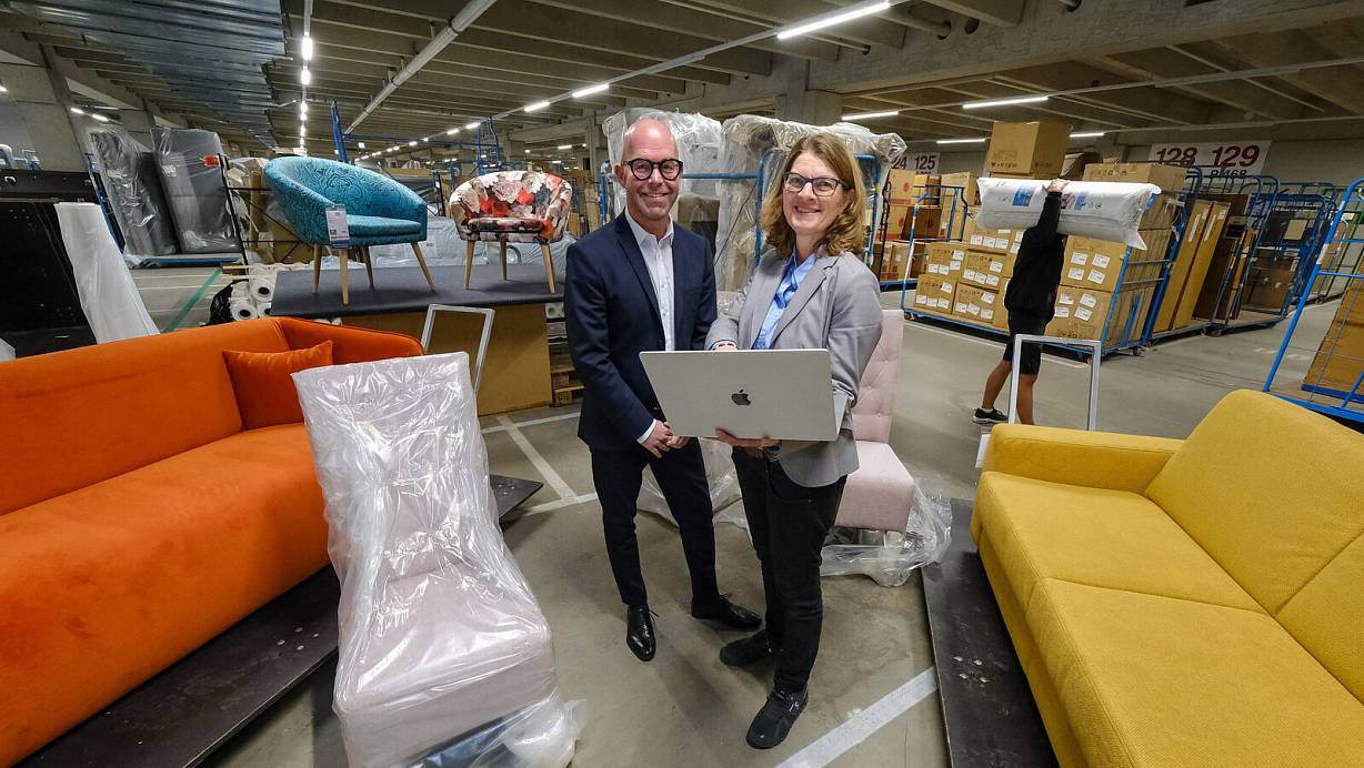 Nadja Beik, die den Zurbrüggen-Onlineshop betreut, und Jörg Schmelter im Möbellager an der Herforder Straße. Nicht nur Kleinmöbel, auch hochpreisigere Sofas, Sessel und andere größere Stücke werden von hier aus an Kunden in ganz Deutschland versendet. | © Andreas Zobe
