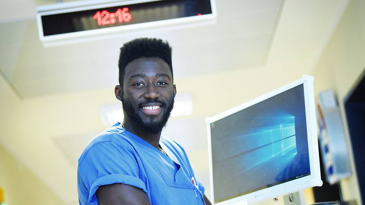Erste Wahl: Ange-Bienvenue Dadjo (27) liebt seine Arbeit auf der onkologischen Station im Johannisstift. Ab und an singt er auch auf dem Krankenhausflur. In seiner Heimat hat er Germanistik studiert, dann aber hier in Bielefeld eine Ausbildung zum Gesundheits- und Krankenpfleger gemacht - und seine Berufung gefunden. | © Barbara Franke