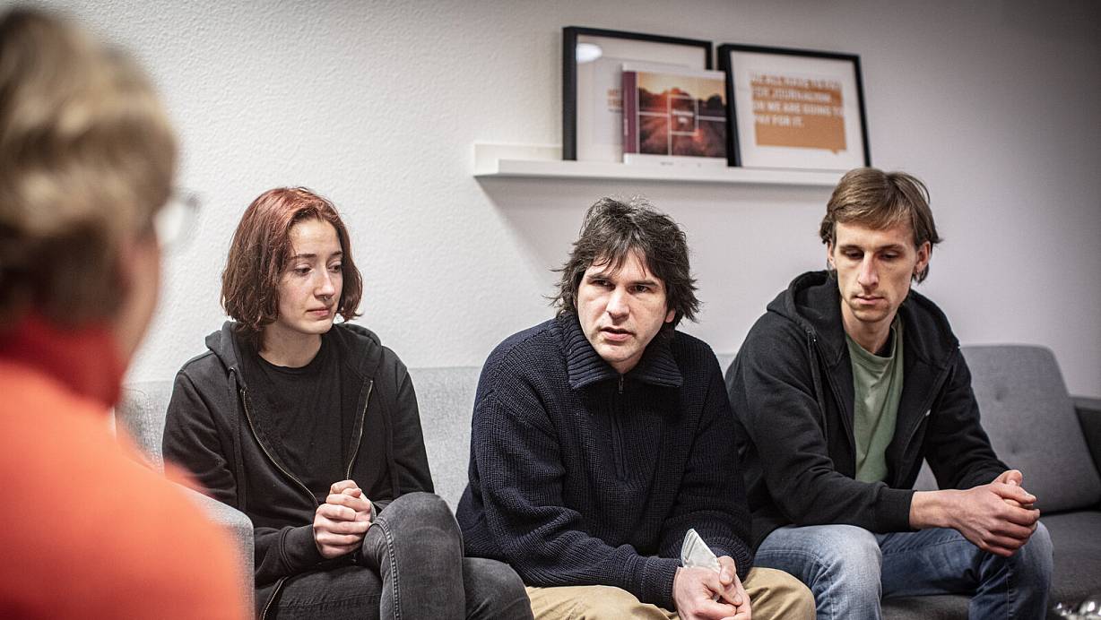 Aktivisten von Extinction Rebellion Bielefeld im Gespräch mit NW-Redakteurin Heike Krüger (von links): Leonie Bäumer (19), Nico Breitsprecher (40) und Max Tiessen (28). | © Mike-Dennis Mller / www.mdm.photo