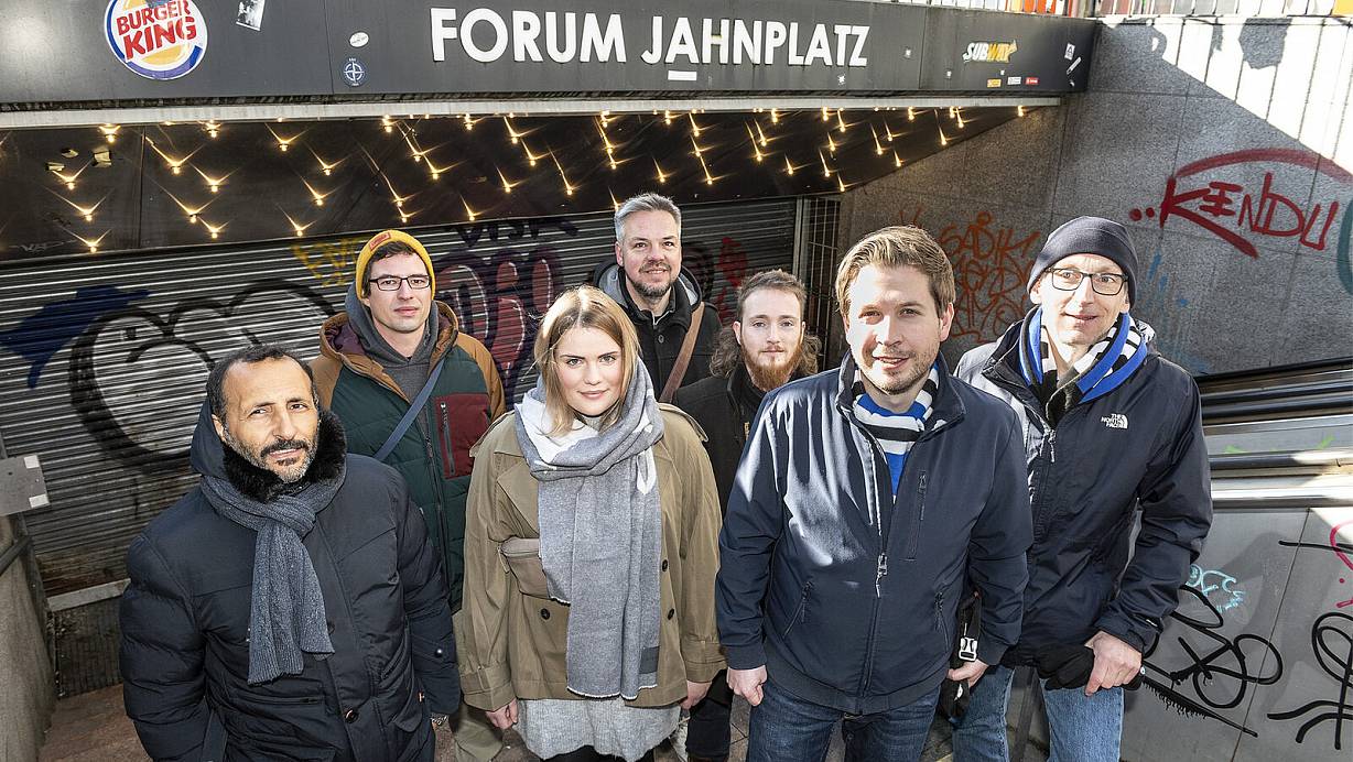 Vertreterinnen und Vertretern von SPD, Jusos, Falken, offener Jugendarbeit und Jugendkulturring sprechen mit Kevin Kühnert (2. v.r.) über ihre Pläne für einen Jugendort unterm Jahnplatz. | © Jörg Dieckmann