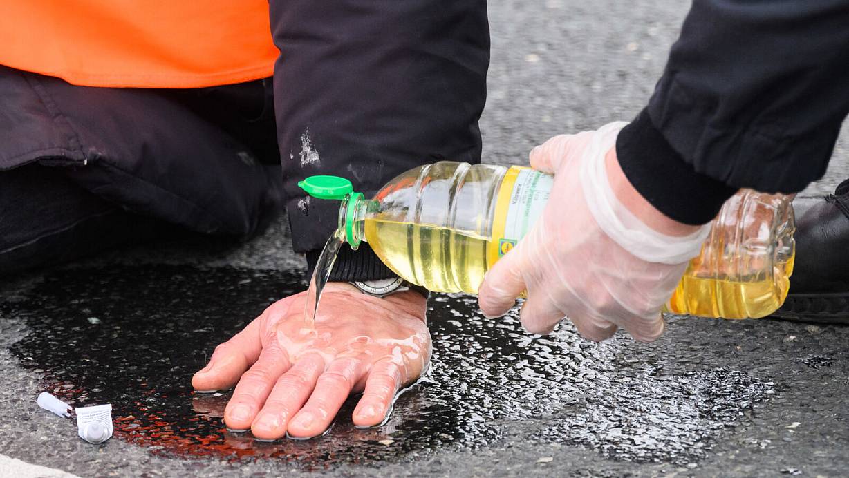 Polizisten lösen die festgeklebten Hände der Klima-Aktivisten mit Speiseöl von der Straße. | © Julian Stratenschulte / dpa