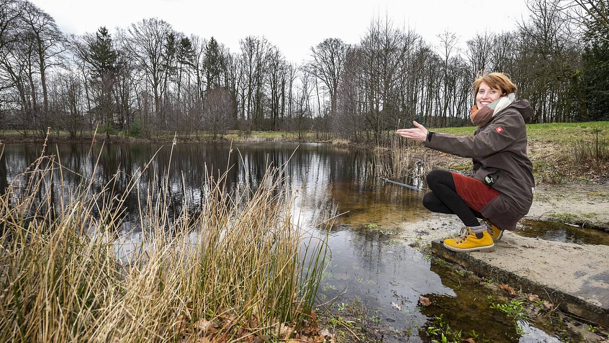 Umweltpädagogin Ilona Chrobak mag den kleinen See im "Sennecamp", der von Wiesen, Bäumen und Sandflächen eingerahmt ist. | © Jörg Dieckmann - www.dieckmann-fotodesign.de