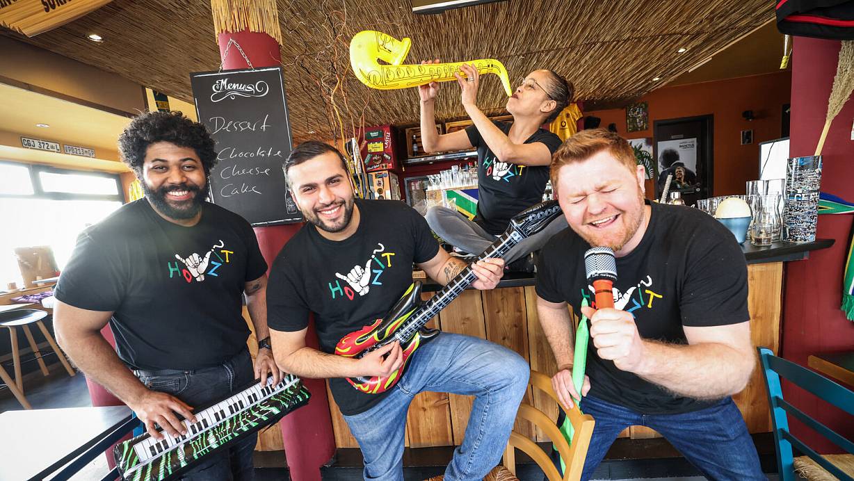 Die Crew des "Howzit" dreht auf: Peter Kausch (Synthesizer), Amir Nemat (Gitarre), Joey Chantal Meis (Saxophon) und ihr Mann Max (Gesang) freuen sich auf kleine Konzerte in ihrem südafrikanischem Restaurant. | © Sarah Jonek