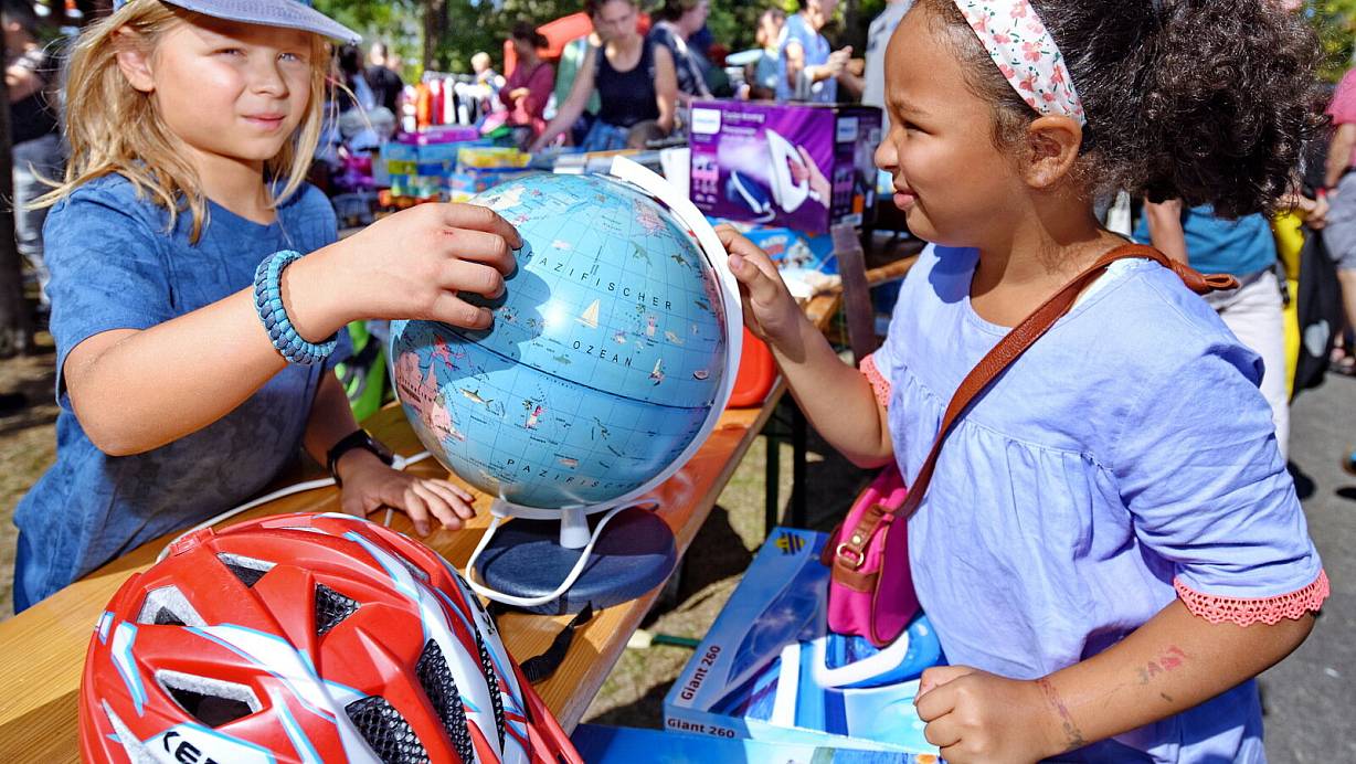 Erinnerungen an den Flohmarkt 2022: Paul Washner (9) hat sein Kinderzimmer entrümpelt und ist mit seinen Eltern zum Flohmarkt gekommen. Anissa (8) aus Stieghorst ist ganz angetan von dem Globus. | © Barbara Franke
