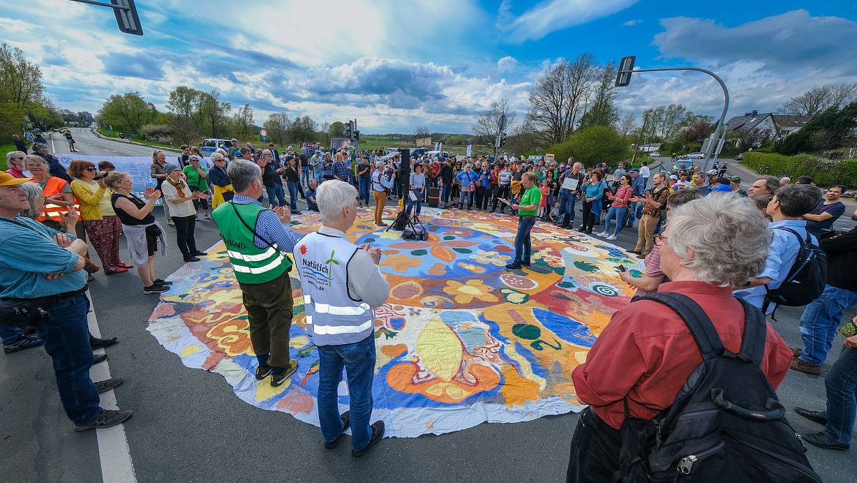 Die Demonstranten haben mitten auf der Herforder Straße ein großes buntes Tuch ausgebreitet und halten eine kurze Kundgebung ab. | © Andreas Zobe