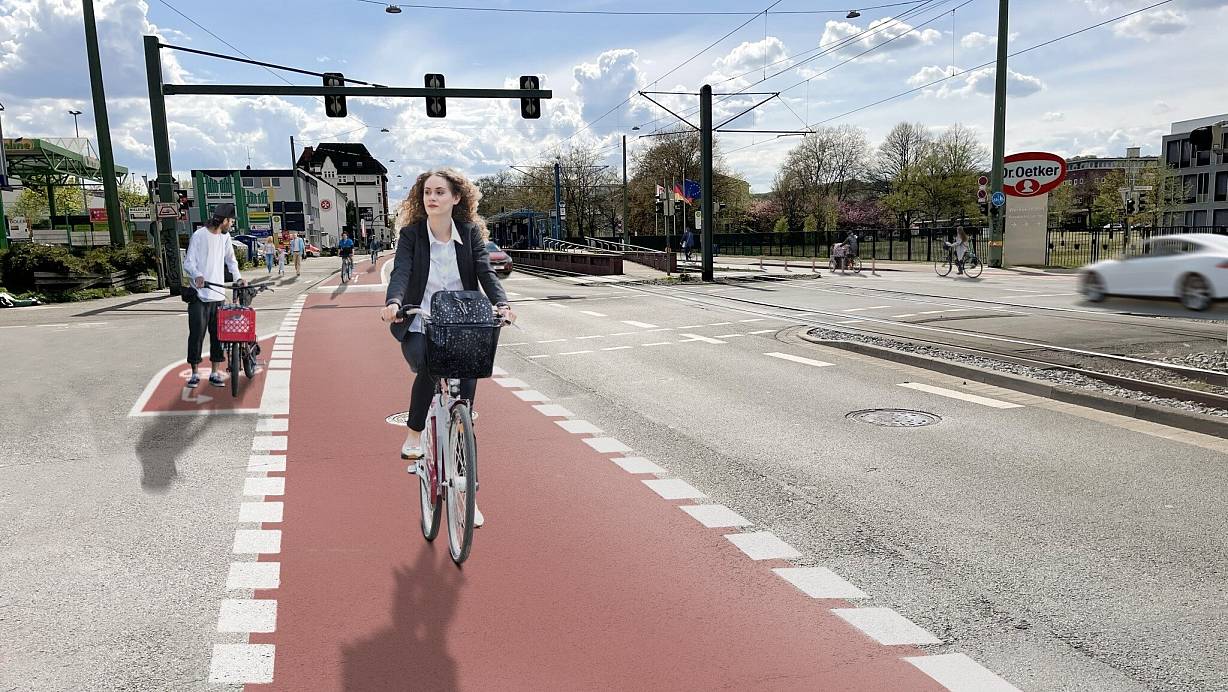 Die Visualisierung zeigt die Kreuzung Quellenhofweg / Friedrich-List-Straße mit Blick nach Brackwede. | © Stadt Bielefeld