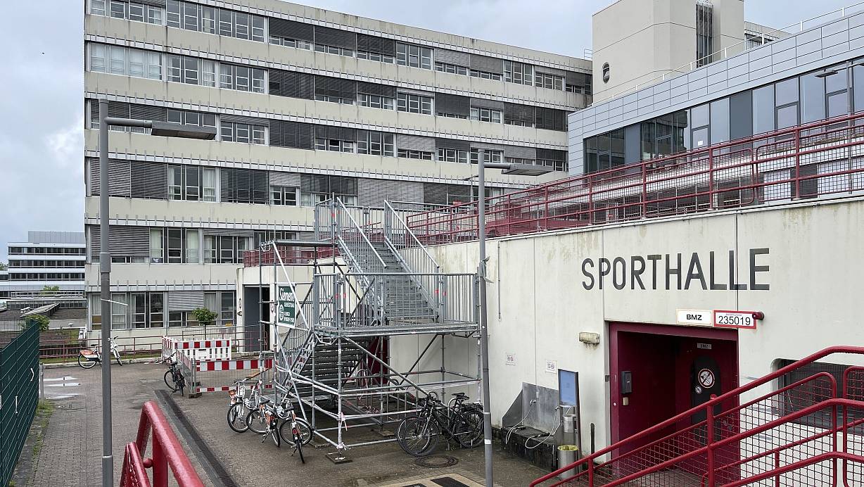 Seit fast zwei Jahren ist der Sportlereingang der Universität Bielefeld nur über eine Behelfstreppe erreichbar. Das rutschige Bauwerk sei als Eingang für eine Hochschule "peinlich", so ein Uni-Mitarbeiter.