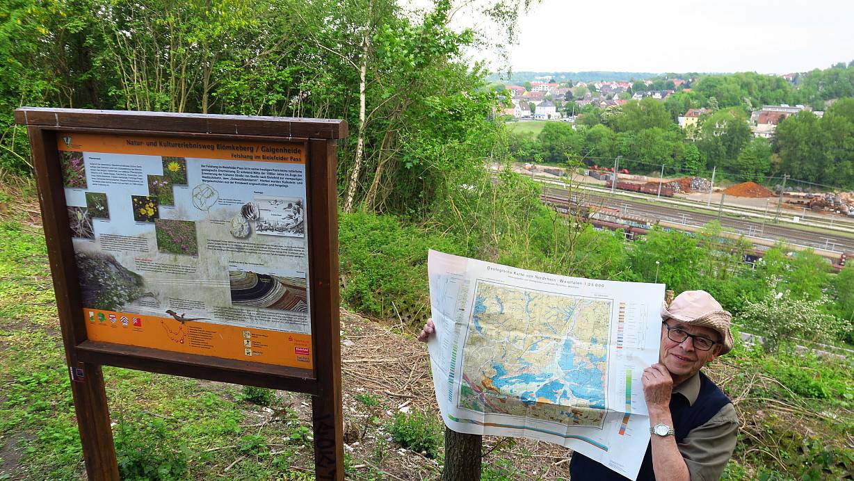 Elmar Döring steht am Galgenberg und ist nicht glücklich mit dem Schild, welches wenig über die Besonderheit erzählt, die hinter ihm, in Bethel, durch einen gewaltigen erdgeschichtlichen Riss entstanden ist. | © Kurt Ehmke