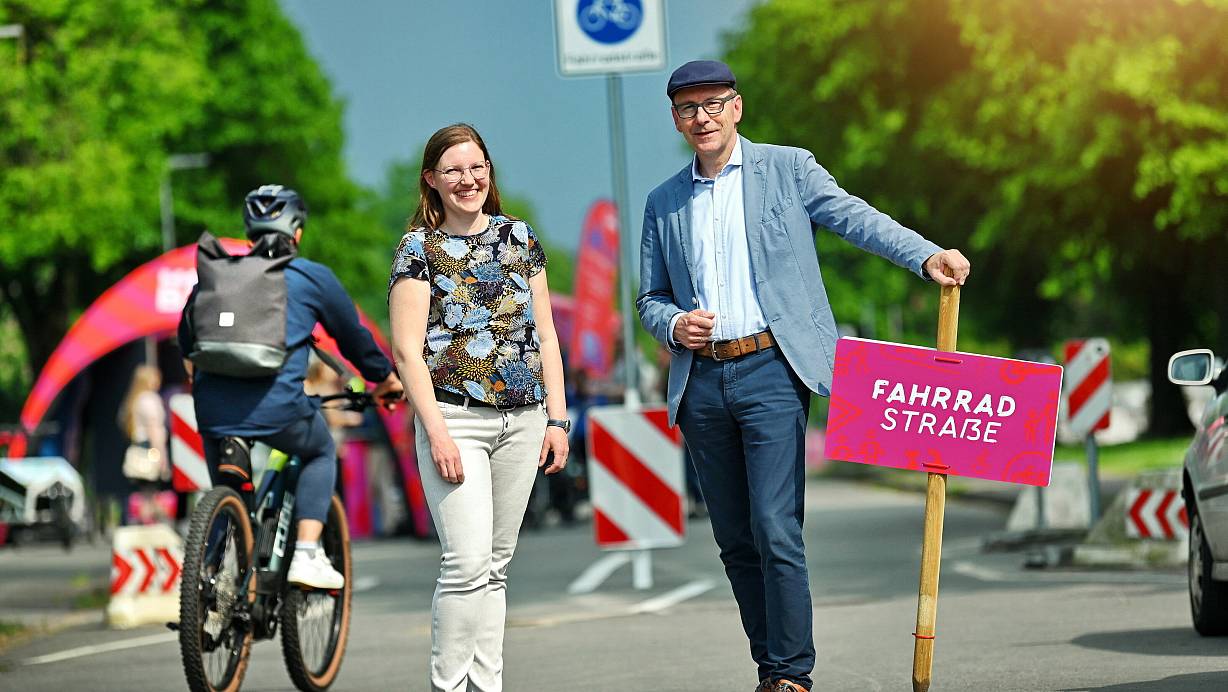 Nora Niebel und Olaf Lewald vom Amt für Verkehr an der Fahrradstraße. | © Barbara Franke