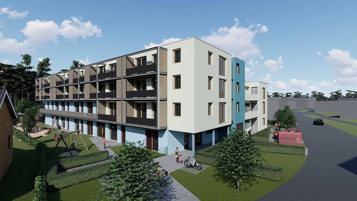 Die neue Kita (blaue Fassade) ist im mehrstöckigen Gebäude zusammen mit 22 Sozialwohnungen geplant. | © Sennestadt GmbH