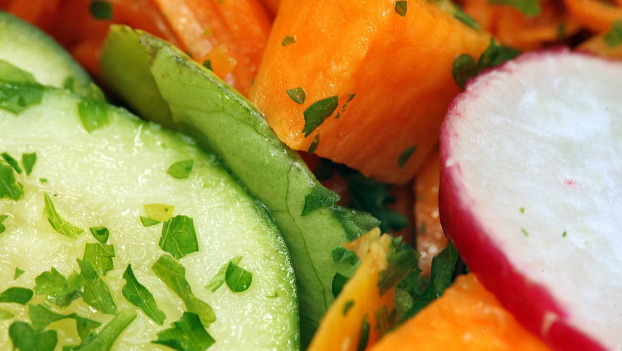 Gesund und lecker essen will gelernt werden: Bei diesem gemischten Salat-Teller mit Radieschen, Karotten und Gurken dürfte das schnell gelingen. | © Fredrik von Erichsen