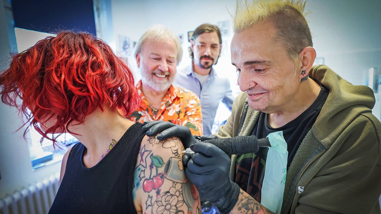 Milos tätowiert über Tattoos hinweg, damit diese nicht mehr zu erkennen sind - und hilft so bedürftigen Menschen, die unter Tattoos oder Narben leiden. Er ist Teil eines Projektes der Stiftung Solidarität von Vorstand Moritz Schön (2.v.r.). Sozialpfarrer Matthias Blomeier findet das Projekt wichtig, Nicole ist hier Fotomodell, sie liebt ihre Tattoos. | © Sarah Jonek