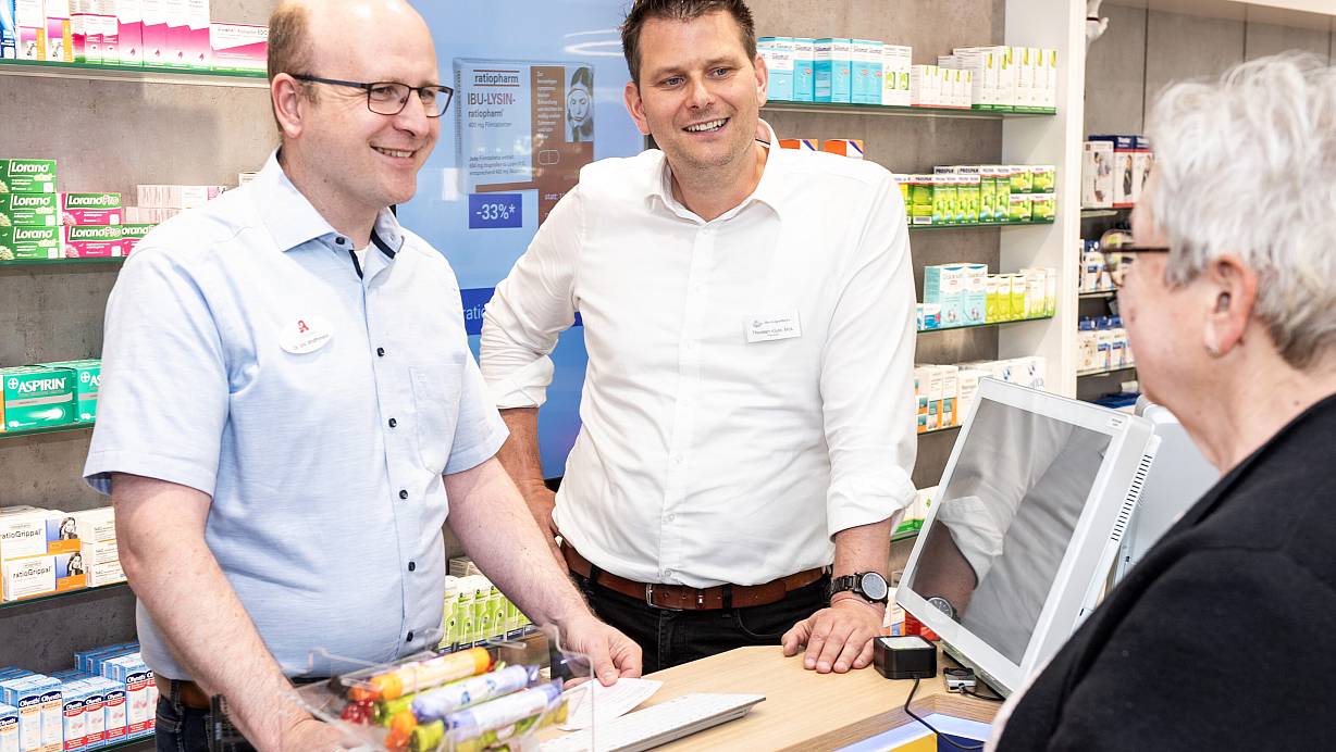 Bei seinem Praktikum in der Dorf-Apotheke von Apotheker Eric Strathmann (l.) durfte Thorsten Klute zwar keine Medikamente herausgeben. Bei Beratungsgesprächen wie hier mit Ursula Husemann konnte er aber sein gesundheitspolitisches Fachwissen einbringen. | © Jörg Dieckmann - www. dieckmann-fotodesign.de