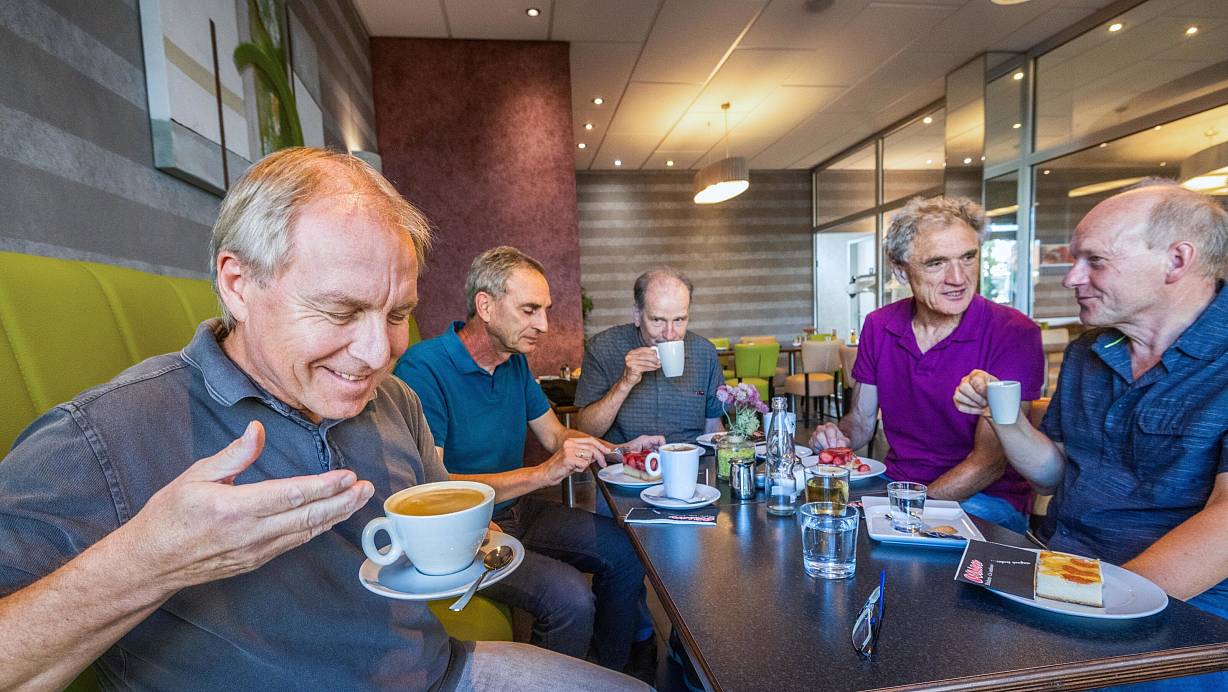 Ja, da riecht man die ganze Bohne: Gunnar Hupp (v.l.), Willy Koch, Stephan Boecken, Wolfgang Stobbe und Werner Lüchtefeld sind die „Café-Tester“ – hier im Einsatz im Café Olsson in Schildesche. Foto: Sarah Jonek | © Sarah Jonek