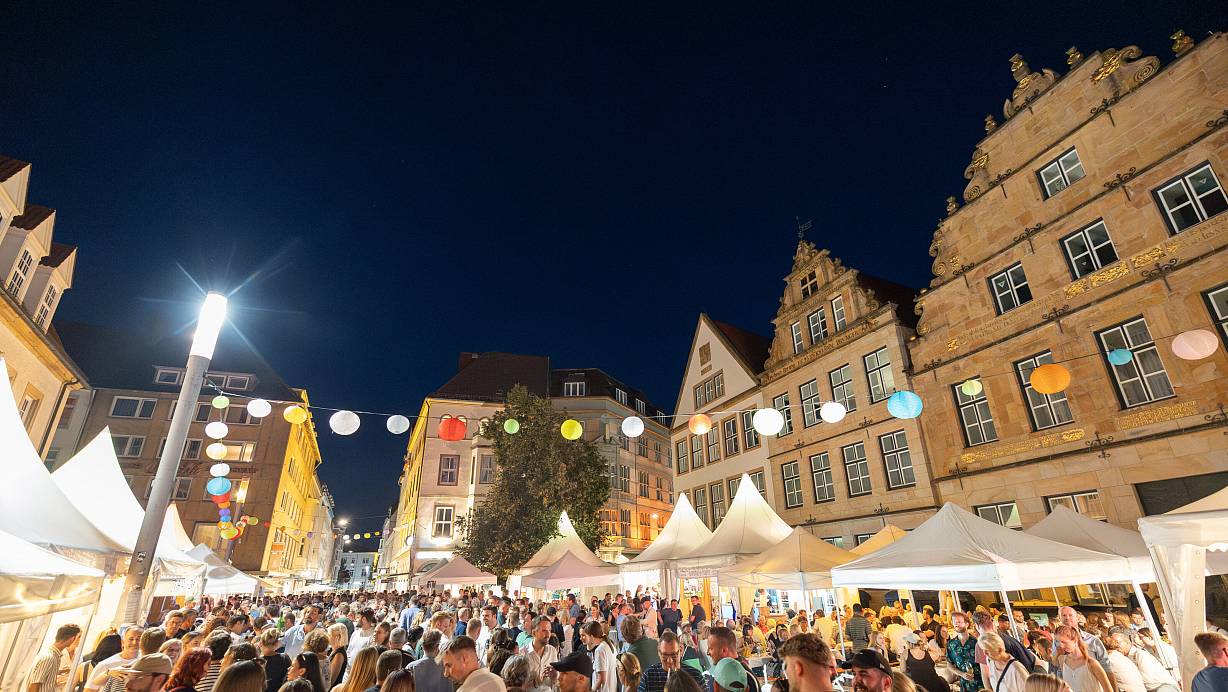Sommernachtsstimmung wie im Süden beim Weinmarkt in Bielefeld: Die von innen beleuchteten Kuppeln der aufgestellten Pagodenzelte, bunte Lampions-Ketten, quer über den Alten Markt gespannt, ließen die historischen Häuserfronten in magischem Licht erscheinen. | © Oliver Krato