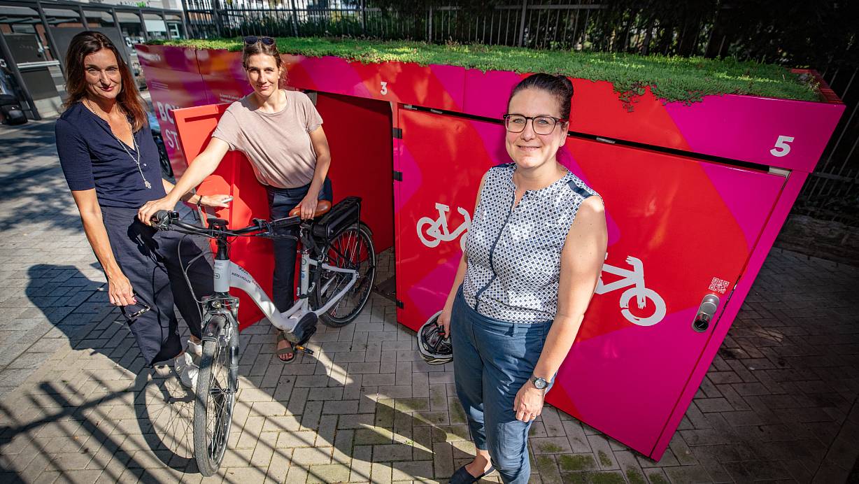 Zeigen, wie die neue Fahrradgarage funktioniert: (v.l.) Anja Klett und Liv Nilsson (Velodepo) und Barbara Choryan (Stadt). | © Mike-Dennis Müller / www.mdm.photo