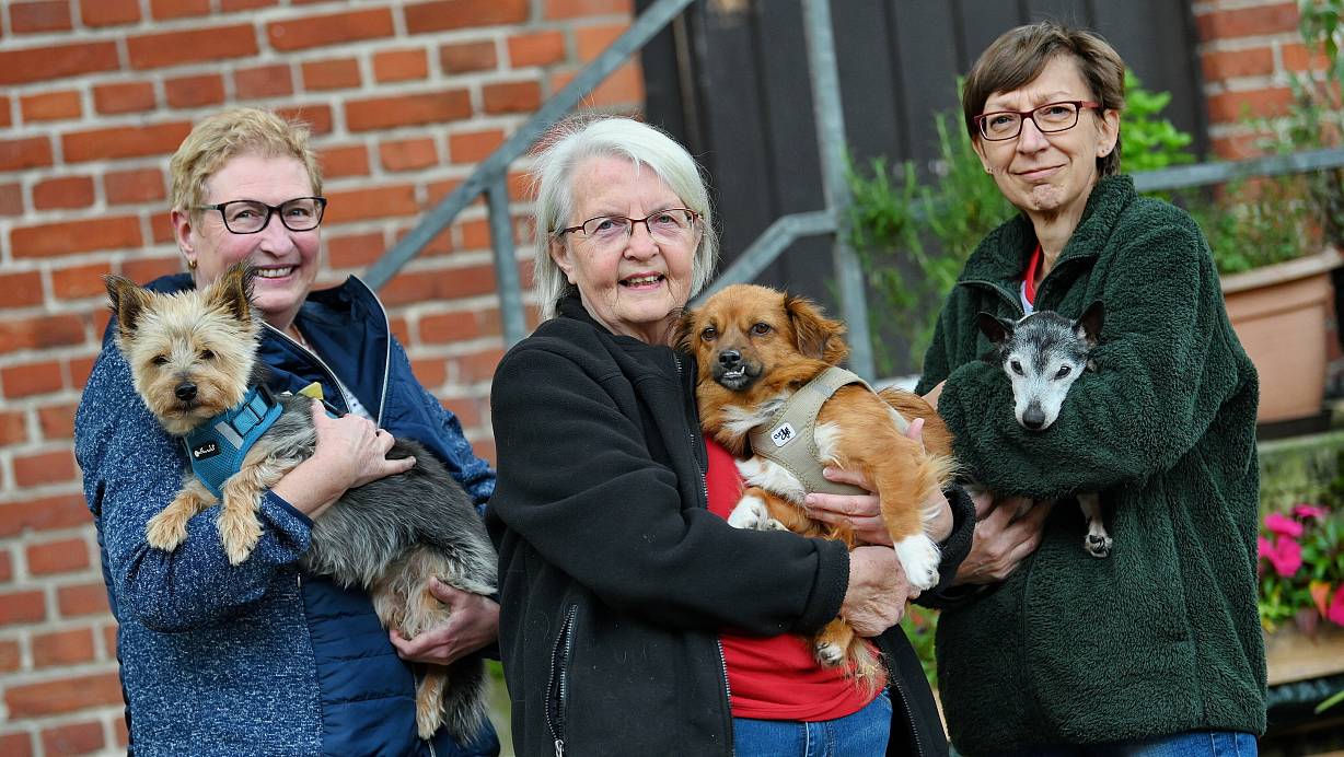Annette Elges (mit Brandy, v. l.), Ulla Müller (mit Vermittlungshündin Dony) und Birgit Winkelmann (mit Hundeopa Willy) haben langjährige Erfahrung im Tierschutz. | © Barbara Franke