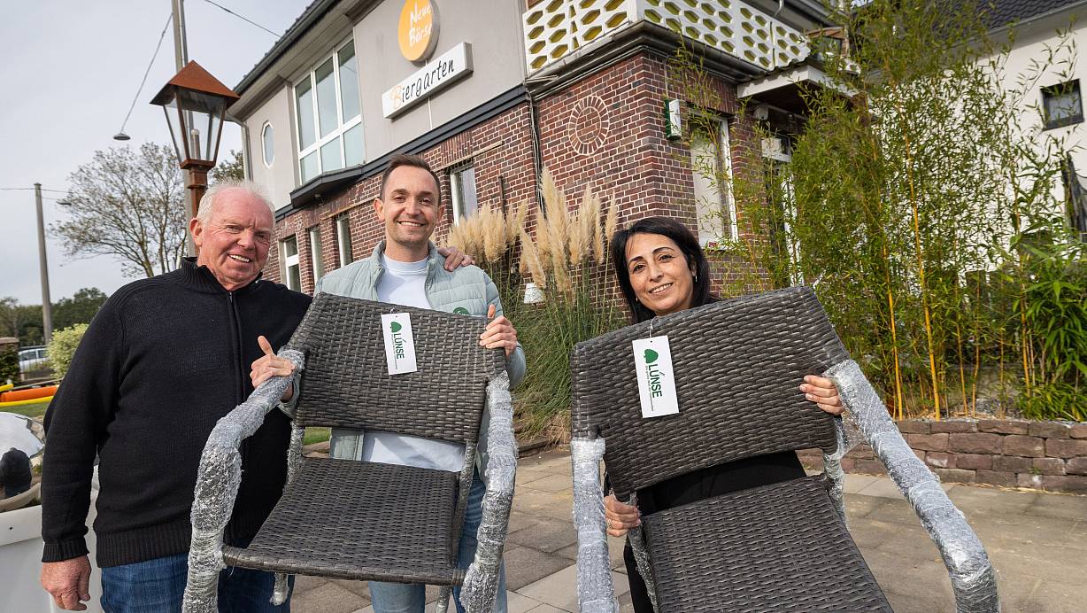 Hans und Tim Lünse spenden aus dem Fundus ihres Gartenmöbelcenters der Betreiberin der "Neuen Börse", Nasrin Haideri, 20 neue Stühle. | © Oliver Krato