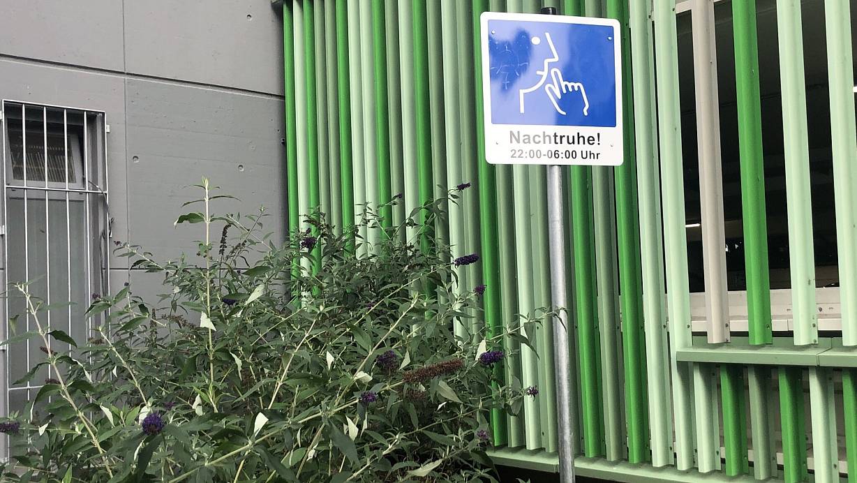Um Rücksicht besonders während der Nacht wird mit dem blauen Schild gebeten, das an der offenen Lutter am Parkhaus steht. | © Silke Kröger