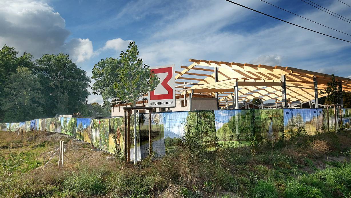 Statt einer naturnahen Fläche für Tiere und Pflanzen ragen in Holtkamp auf 2,5 Hektar Land Stahlstreben aus der Erde, auf denen Holzgiebel ruhen, die den Naturgewalten nun schutzlos ausgeliefert sind und mit der Zeit verfallen werden. | © Andreas Frücht
