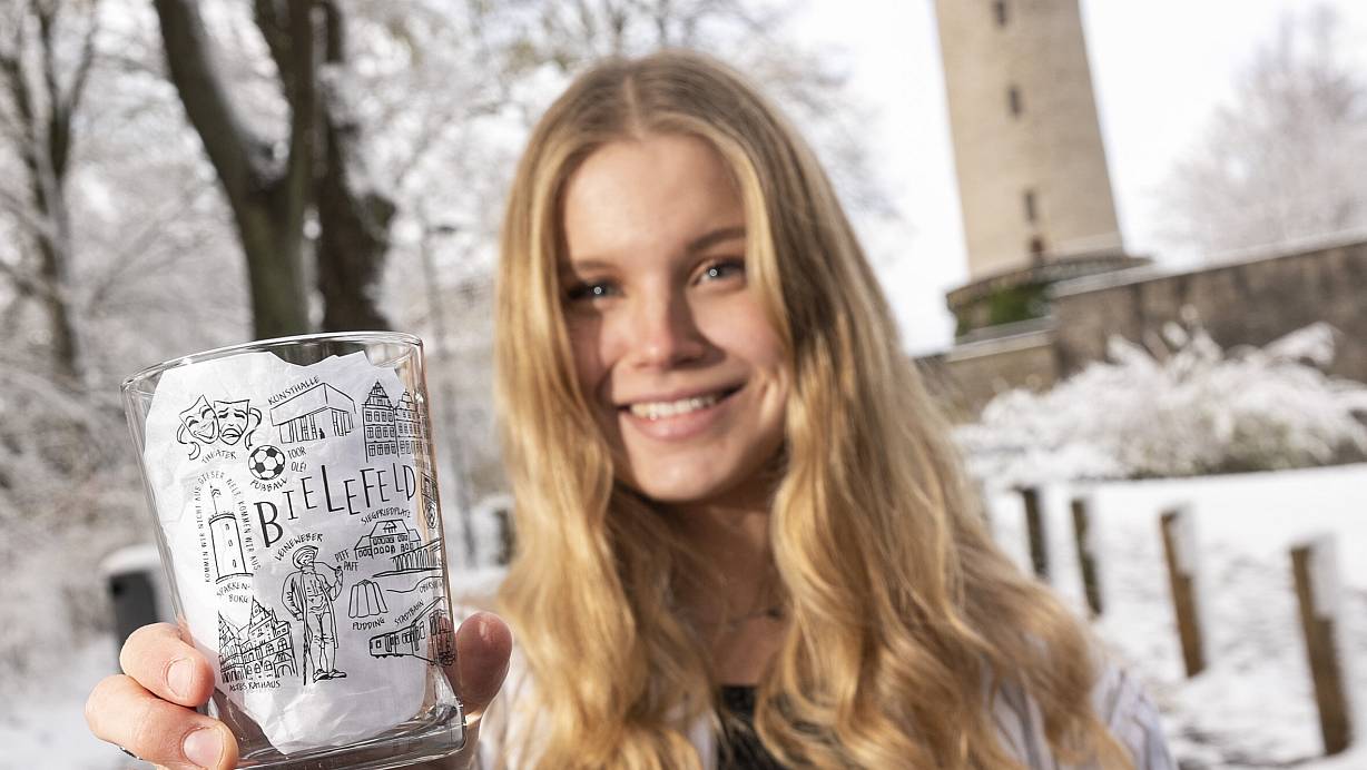 Kim Vollmers zeigt ihr Heimatliebe-Glas, welches sie zum Abschied aus Bielefeld auf den Markt bringt. | © Jörg Dieckmann - www.dieckmann-fotodesign.de