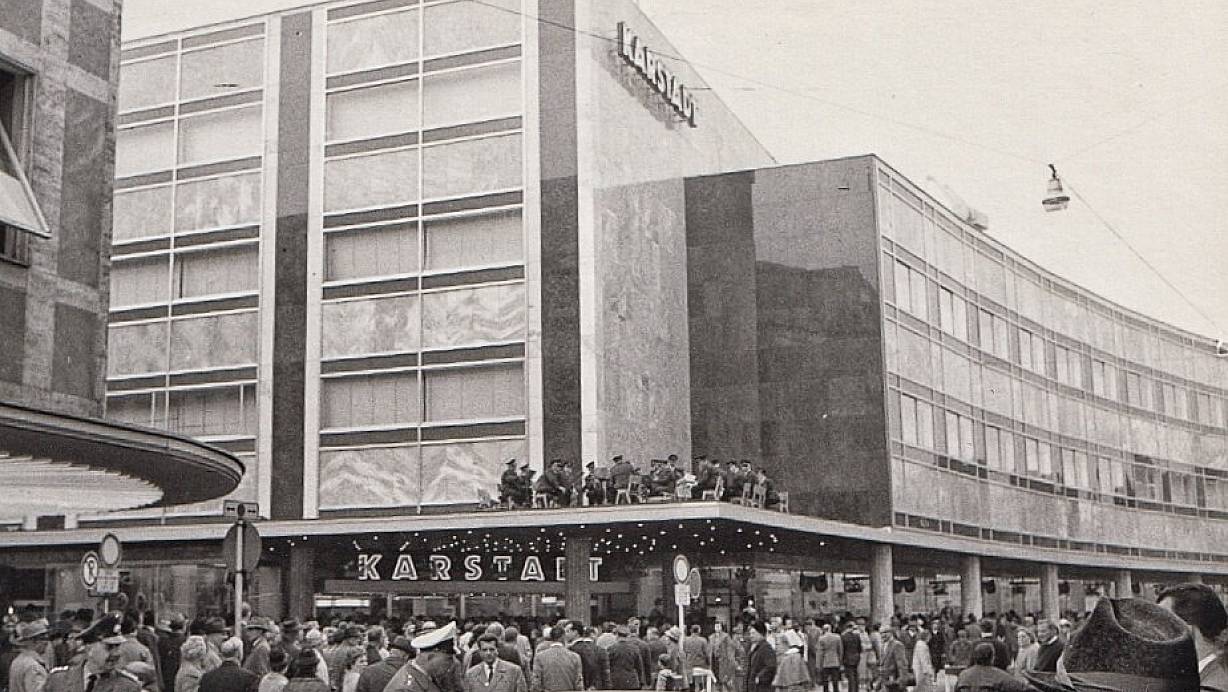 Was für ein Start im April 1964: Die Massen drängten sich vor dem Karstadt-Haupteingang an der Ecke Arndstraße/Bahnhofstraße, auf dem Vordach spielte zur Eröffnung eine Blaskapelle. | © Stadtarchiv