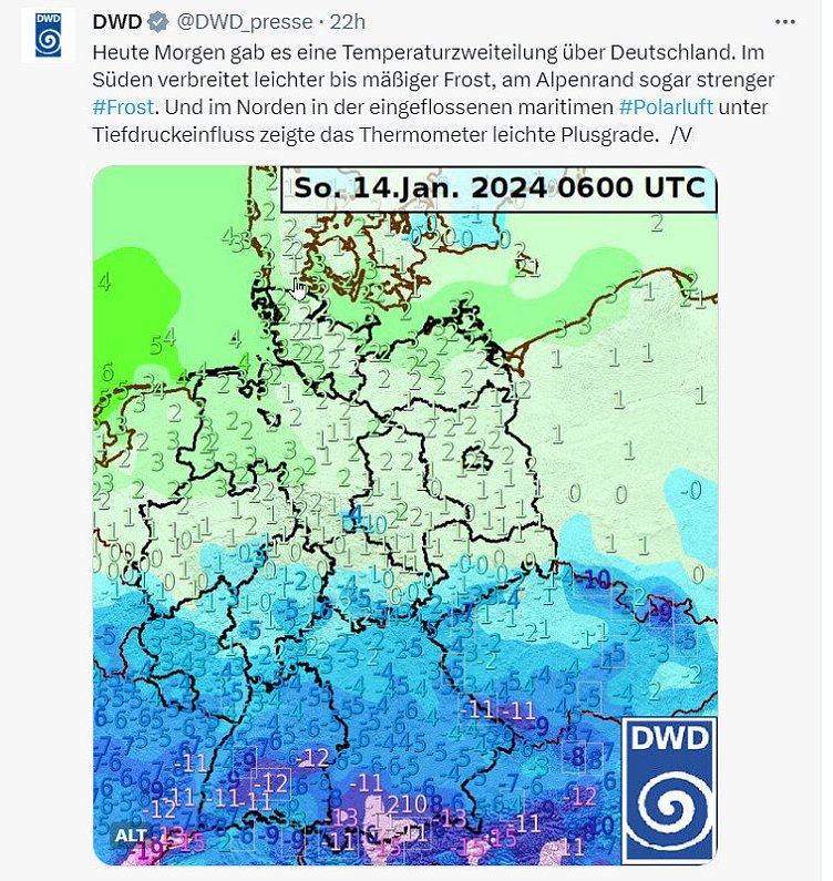 Der DWD warnte am Montagvormittag und noch im weiteren Tagesverlauf in tiefen Lagen vor Tiefstwerten um 0 Grad, im Bergland bei -1 bis -4 Grad. Am Montag im Bergland weiterhin Dauerfrost mit Höchstwerten zwischen 0 und -3 Grad.