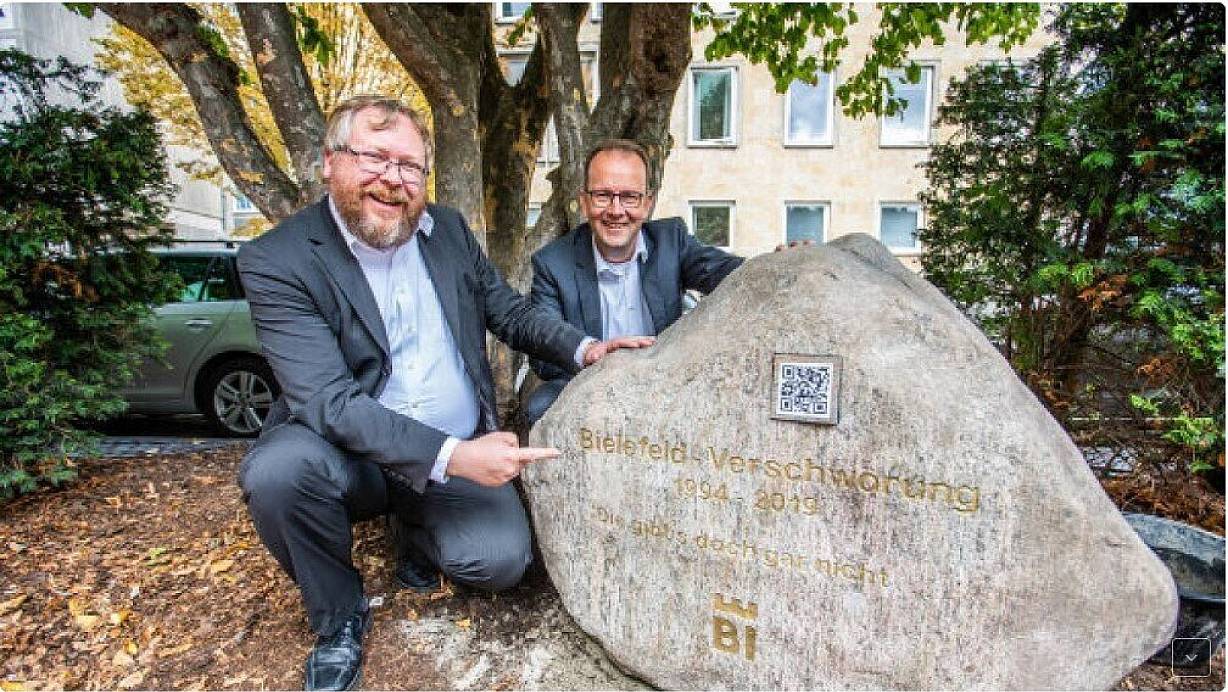 Zum Abschluss der Kampagne enthüllten Achim Held (l.), der vor 25 Jahren die Satire zur "Bielefeld-Verschwörung" im Internet veröffentlichte, und Martin Knabenreich (Bielefeld Marketing) einen Gedenkstein | © Bielefeld Marketing
