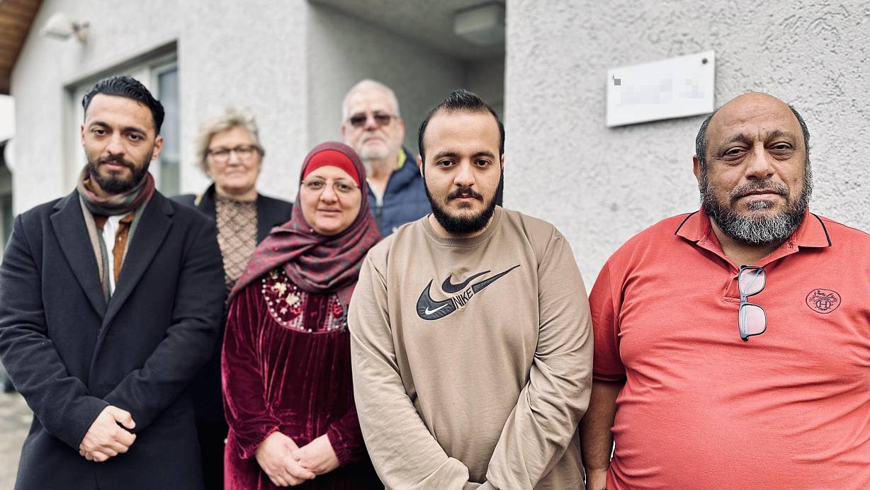 Hisham Abdulzaraq (l.) mit Eltern und Bruder vor dem Haus der Busses (hinten), in dem sie seit acht Jahre wohnen. | © Stefan Becker