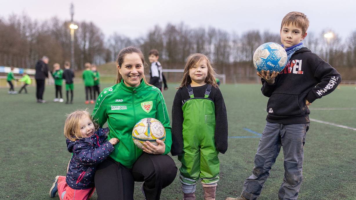 Powerfrau: Sara Castellon (32) mit ihren Kindern auf dem Fußballplatz des Tus Dornberg. Die 32-Jährige trainiert die G-Jugend, "weil's sonst keinen gab". | © Oliver Krato