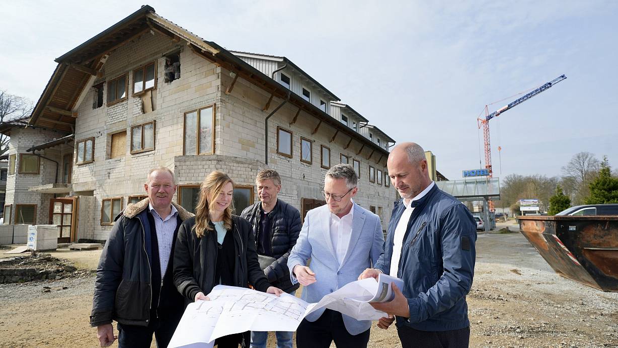 Werner Kordtomeikel (v.l.), Jutta Steinkemper, Thomas Herzog, Marcus Scharpenberg und Christian Steinpass schauen sich die Umbaupläne an. | © Peter Unger