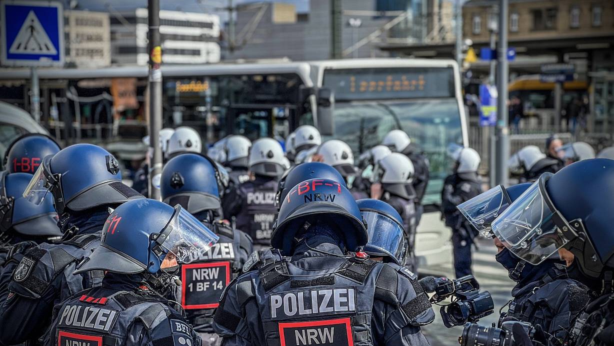 Einsatzkräge in Schutzmontur und ausgerüstet mit Videokameras begleiteten das Risikospiel von Arminia Bielefeld gegen Preußen Münster. | © Paul Brinkmann
