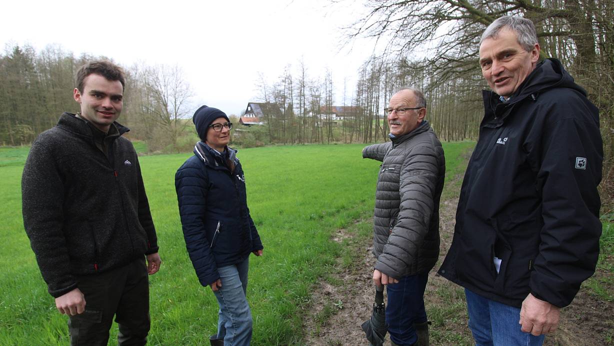 Augenzeuge Horst Baumgart und Tochter Kirstin Grether (2.u.3.v.l.) sind geschockt. Jagdpächter Jobst (l.) und Klaus Buschmann nehmen den Ort, an dem die Hunde-Attacke passierte, in Augenschein. | © Sylvia Tetmeyer