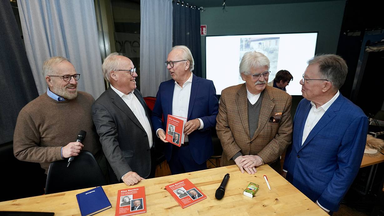 Buchpremiere im "CaféNio": Rainer Wend (Mitte) zusammen mit Moderator Peter Stuckhard, OB Pit Clausen, Bielefelds "Mister Europa" Elmar Brok und Einlader Dirk Ukena (von links). | © Peter Unger