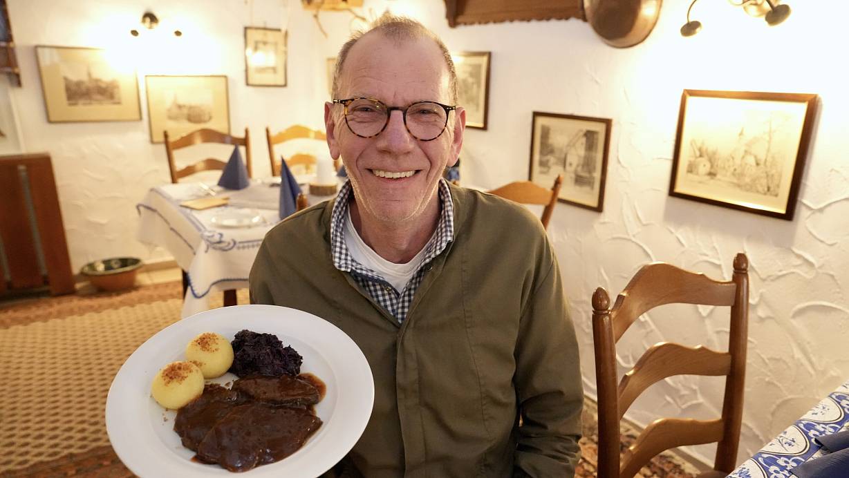 Thorsten Seelmeyer serviert einen Sauerbraten mit Rotkohl und Klößen. | © Peter Unger