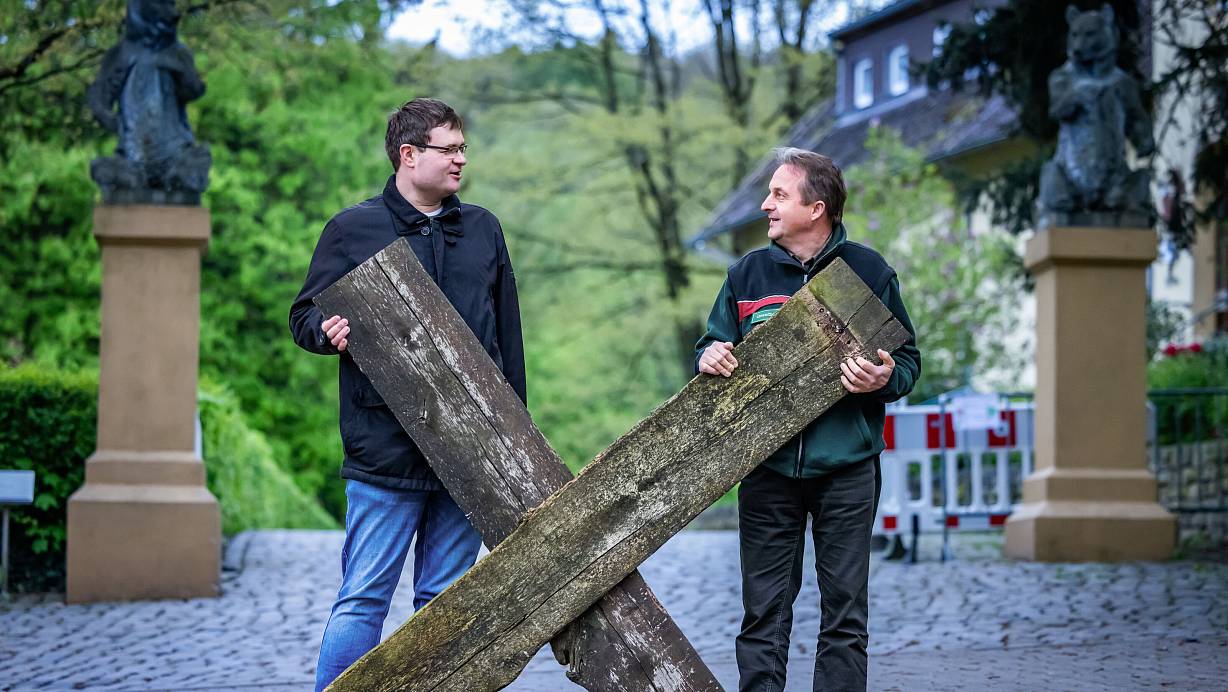 Benjamin Ibler (Abschnittsleiter Tierpark, l.) und Herbert Linnemann (Leiter Forsten und Tierpark) am Eingang mit Balken des Holzzaunes, der abgebaut wird. Sie freuen sich über den neuen festen Zaun, der jetzt kommt, „weil er zum Wohl der Tiere ist“. | © Sarah Jonek Fotografie