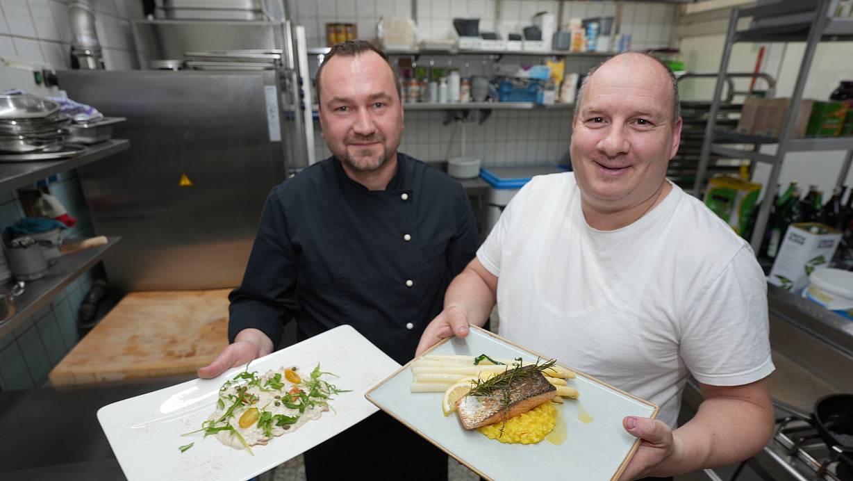 Die Köche Michael Stanislowski (l.) und Maik Hauptfleisch präsentieren ein Spargelgericht und eine Vorspeise. | © Peter Unger