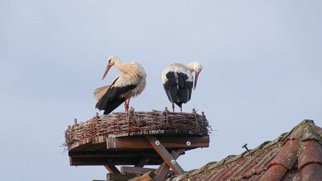 „Die beiden halten eng zusammen und sind ständig im Nest, alles deutet auf eine Brut hin“, sagt Jürgen Albrecht vom NABU. Die Mitarbeiter auf dem Halhof sind begeistert. So konnten sie anfangs einen regelrechten Kampf um das Nest mit dem besonders guten Fernblick beobachten. Dann hat sich das inzwischen auf Rosa und Karl getaufte Pärchen durchgesetzt, und Ruhe ist eingekehrt. Nur mit viel Geduld und an sonnigeren Tagen ist mehr von den beiden zu sehen als eine Schnabelspitze, die über den Nestrand lugt.