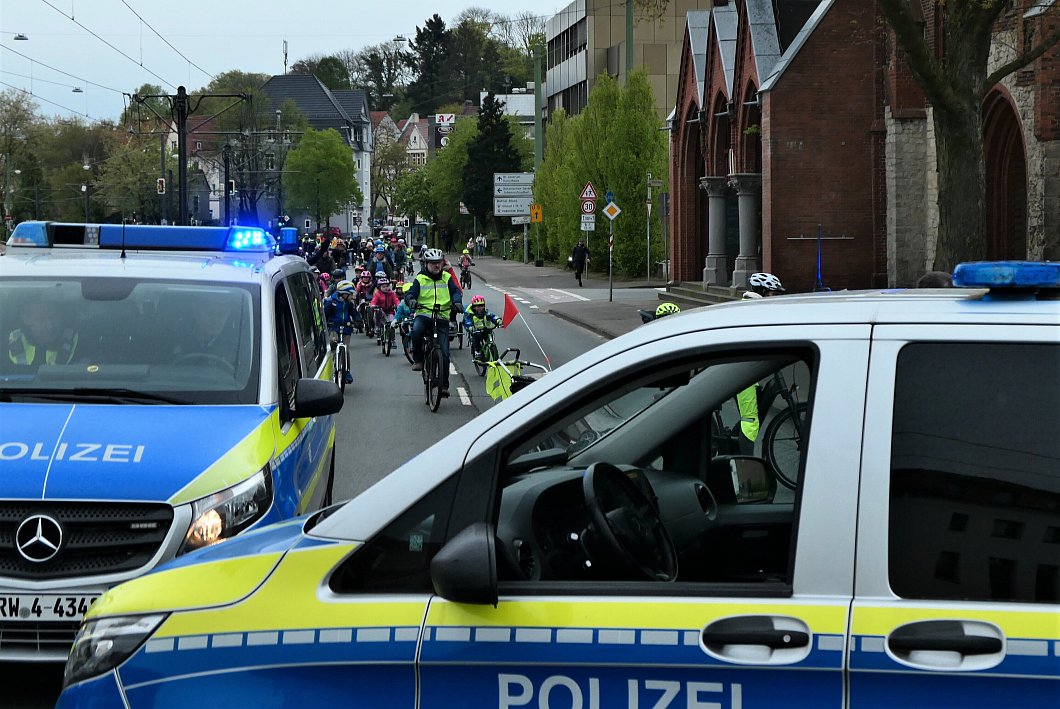 Bielefeld. Etwa 200 Radfahrer nähern sich sternförmig der Martinschule, begleitet von haufenweise Polizei auf Motorrädern und in Polizeibullis - und das bei Nieselregen und 5 Grad. Was ist da los? Bielefelds erste Schülersternfahrt ist los - gut 120 Martinschüler mit Eltern und Verwandten treten in die Pedale. Warum denn das?