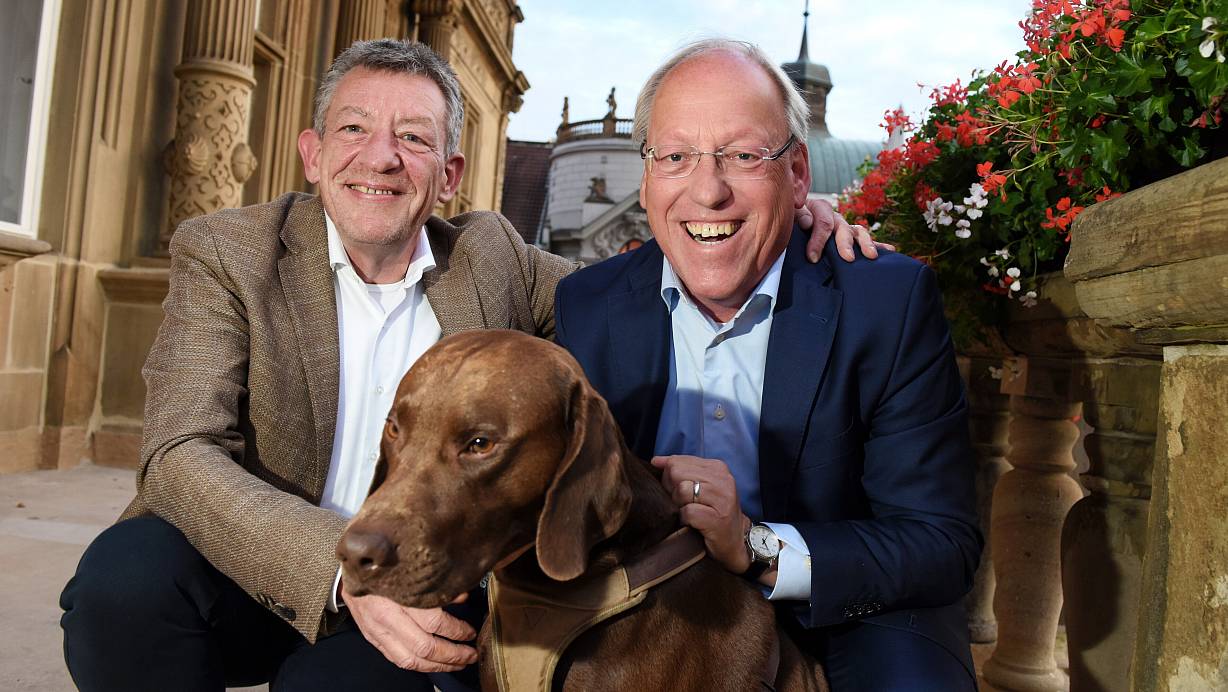 Oberbürgermeister Pit Clausen (SPD) mit seinem Mann Thomas Sopp und Hund Scotty auf dem Rathausbalkon: 2025 möchte Clausen nicht erneut kandidieren. | © Barbara Franke