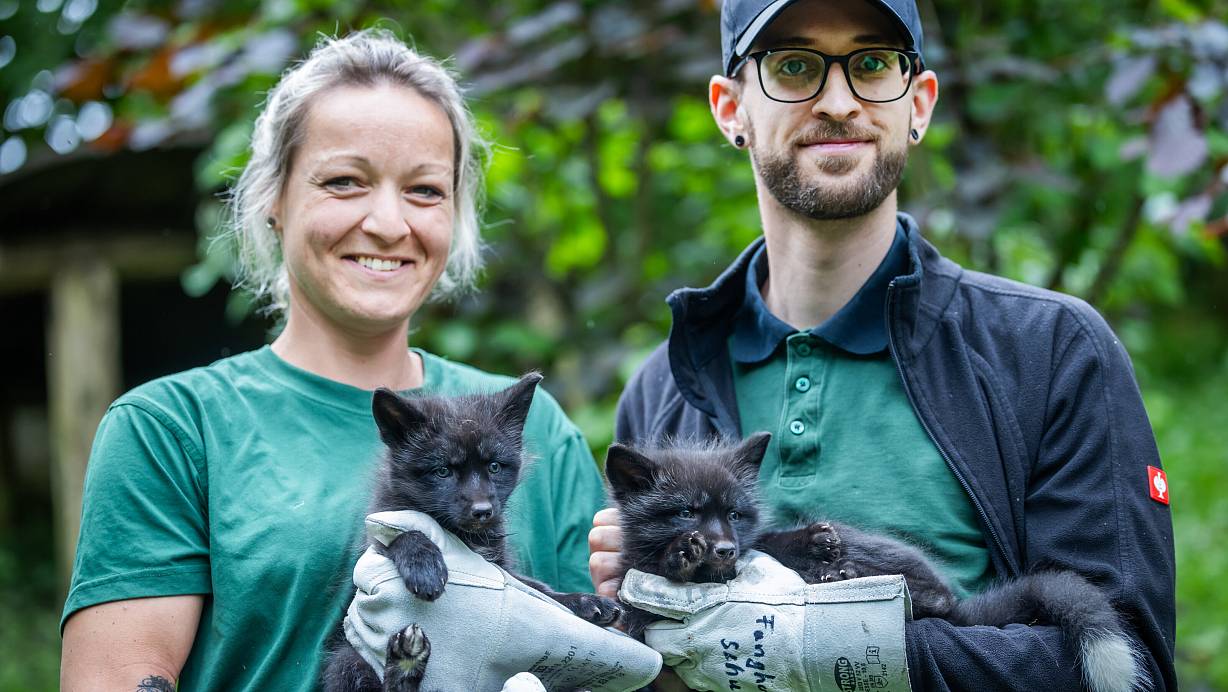 Tierpflegerin Jana Derbogen hält das Mädel im Arm, Tobias Diekmann präsentiert den jungen Rüden. | © Sarah Jonek Fotografie