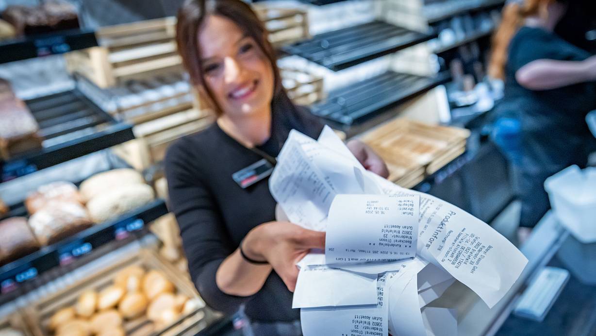 Eine Verkäuferin der Bäckerei Olsson in Bielefeld präsentiert den immer noch anfallenden Papiermüll durch Kassenbons. | © Sarah Jonek Fotografie