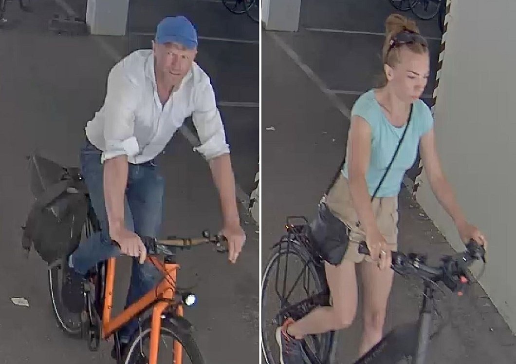 Der Mann (blond, schlank, blaue Kappe, weißes Hemd, Bluejeans) fuhr ein orange-braunes Fahrrad mit grauer Fahrradtasche. Seine Komplizin (dunkelblondes Haar mit Dutt, schlank, türkises T-Shirt, beige, kurze Hose, Sonnenbrille, Augenbrauen geschminkt) trug blau-orangene Schuhe, hatte eine schwarze Damenhandtasche mit Schulterriemen bei sich und hatte am rechten Mittelfinger einen Ring.