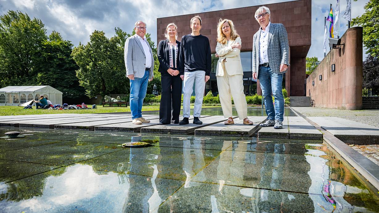 Begrüßen den Architekten Adam Caruso (M.) vor der Kunsthalle: (von links) Oberbürgermeister Pit Clausen, Christine Harodt (ISB), Kunsthallen-Chefin Christina Végh und Kulturdezernent Udo Witthaus. | © Sarah Jonek Fotografie